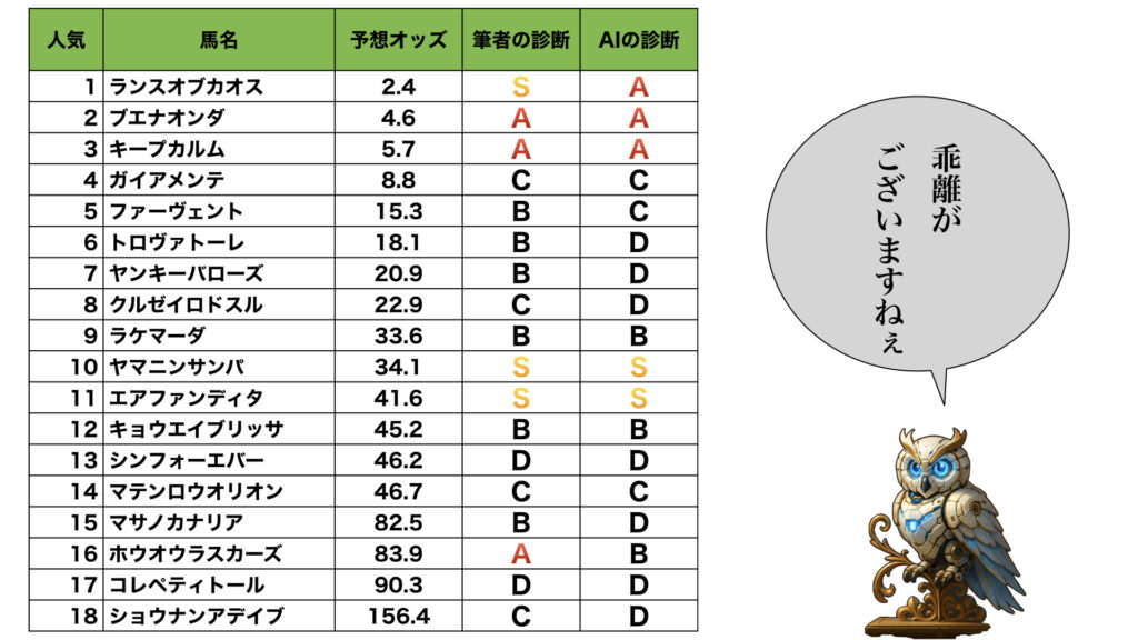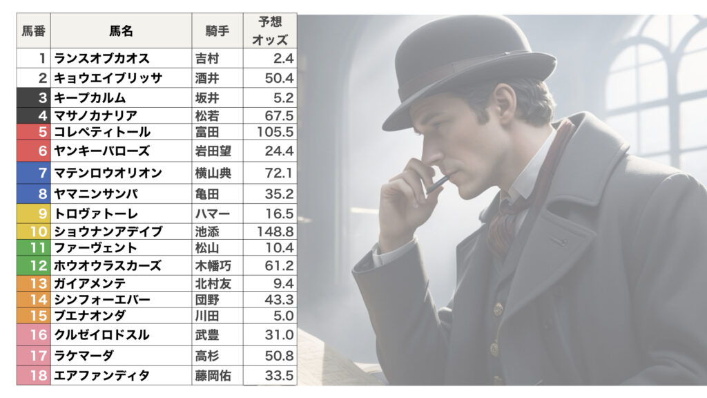 その結果、最も美味しいと言える穴馬はエアファンディタ。枠順の恩恵とポテンシャルの高さから手堅いのはランスオブカオス―――という結果に着地しました。