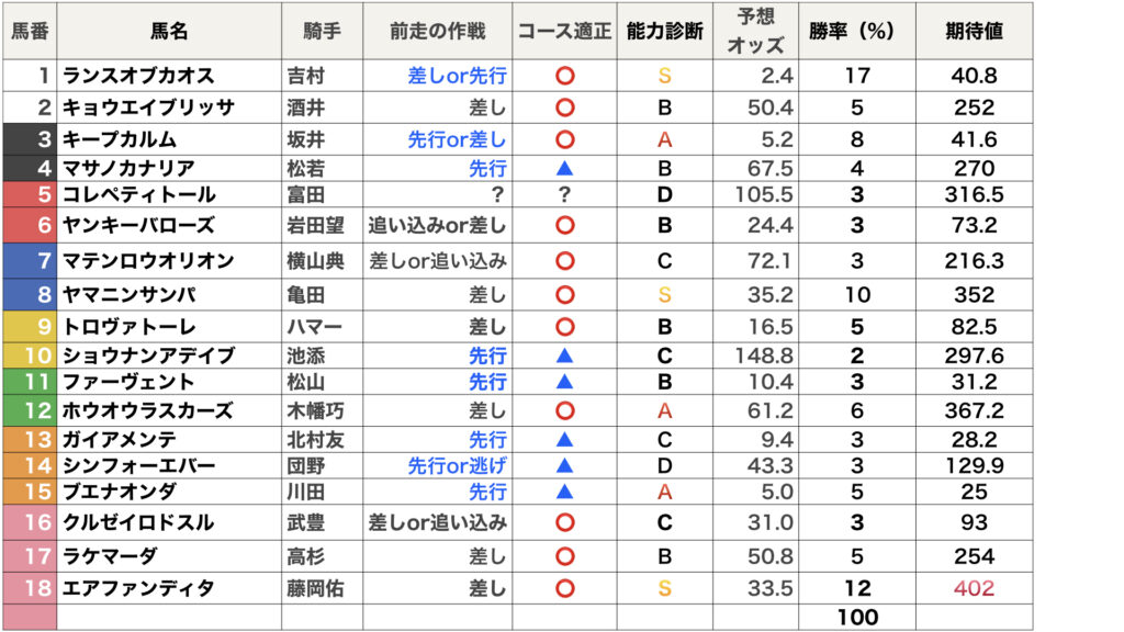 結論、最も勝率が高いのはランスオブカオス。最も回収率と勝率のバランスが美味しいのはエアファンディタ。競争能力診断・枠順・コース適正から勝率を推理。