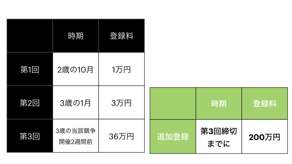 再度この表に登場願いました。ご覧の通り、クラシックレースにでる2週間前に200万円を払うことで第1回クラシック登録を逃した競走馬にも登録を許可する制度。それがクラシック追加登録制度です。