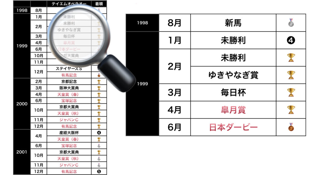 ここで陣営側でクラシック追加登録という選択肢が急浮上。それによって200万円という大金を投資する価値がテイエムオペラオーにあるか否かの論争に発展したようですが、陣営はテイエムオペラオーのクラシック追加登録を決断。