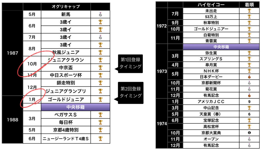 答えはデビュー前の展望にあります。ハイセイコーはデビュー以前からその恵まれた体躯を有望視され、中央競馬でも戦っていけるポテンシャルを期待されていました。結果的に地方大井所属でデビューするわけですが、その後の目覚ましい記録も相まって10月初回のクラシック登録は実施された。・・・というわけですね。