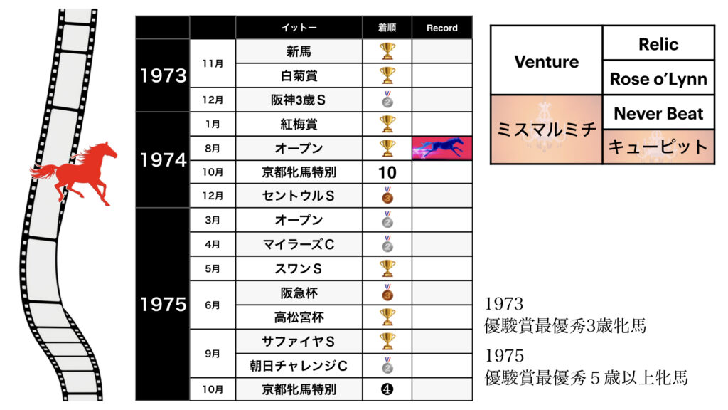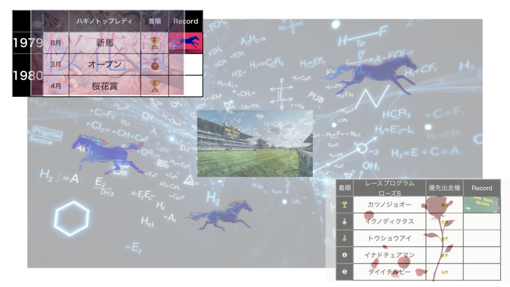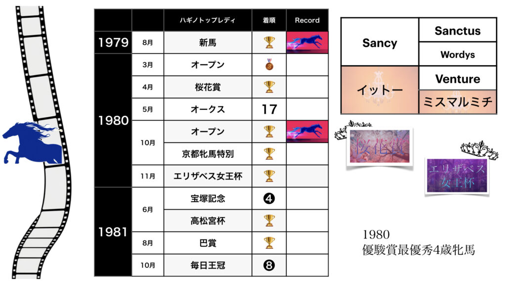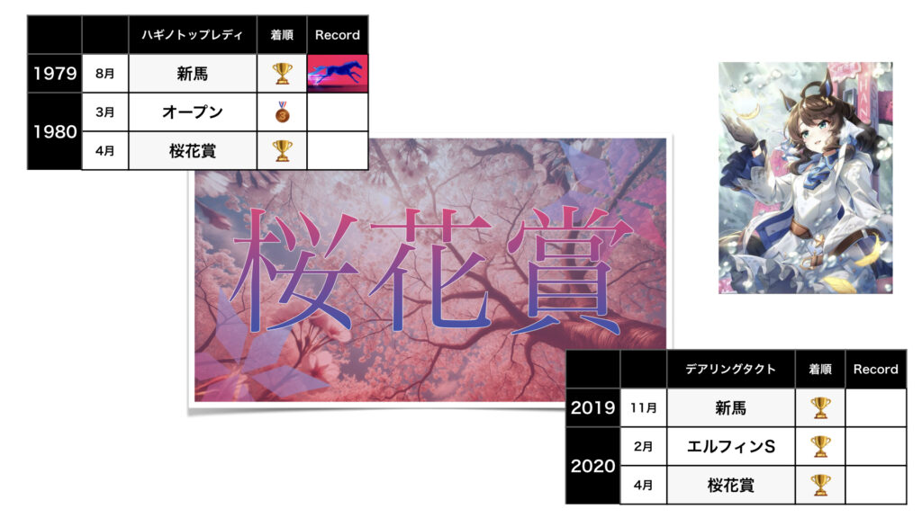 この成績は2020年デアリングタクトが桜花賞を制するまで破られることがなかった。わずか3戦目でティアラの頂の一つに辿り着く。これは並大抵のことではない。経験も実力も発展途上の初期段階で女王の冠を頂く。40年間も記録が破られなかったのも頷ける。
