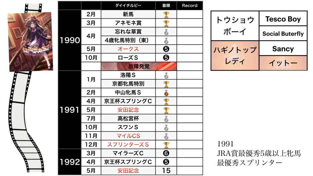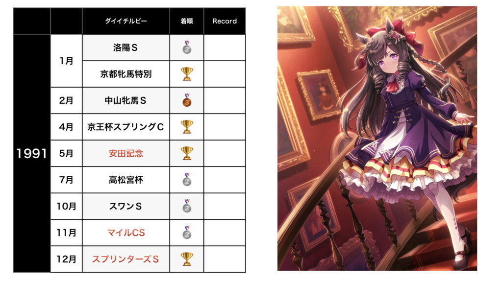 彼女はプレッシャーを跳ね除け証明した。己も華麗なる一族の一員であると。それは長い沈黙の後に放たれた閃光のようだった。臨界を超えた核反応は一気にエネルギーを解放し、周囲の全てを照らし出す。1991年のダイイチルビーは、確率論的な偶然ではなく必然として、その光を放ったのである。