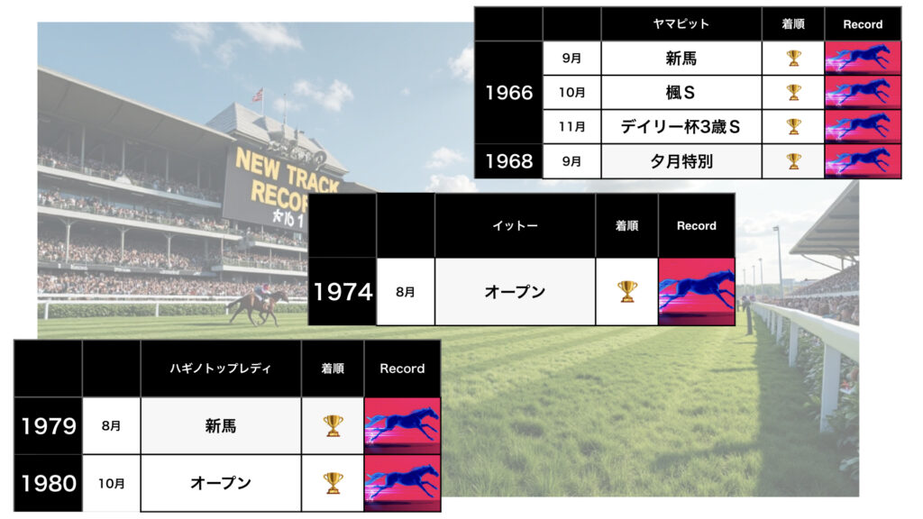 ヤマピット・イットー・ハギノトップレディ。3名とも驚くことにレコード記録を樹立している。彼女らのレコード更新は、重力に引かれながらも常に軌道を突き抜ける弾丸のようだった。軌跡を描いた瞬間、それは競馬場という実験場において「既存の定数を書き換える行為」となった。