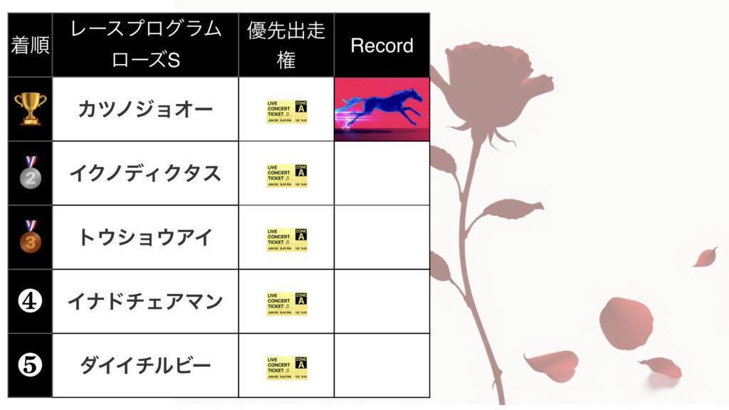 当時、ティアラ3冠目はまだエリザベス女王杯。その🎫優先出走権を獲得するべく挑んだと思われるローズSでライバルホースにレコードタイムを叩き出される。