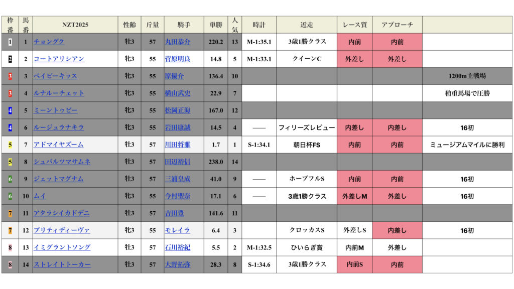 過去レースを分解し、実用性のある予想ファクターをサルベージ。2025~2023年の🟩GⅢニュージーランドトロフィーの結果を受けてどのようなアプローチで予想をすれば正解に辿り着けるか検証します。良馬場時は競争パフォーマンスを推し量る 3STEP。稍重時はパワー適正を推し量る 3STEPで攻略可能。