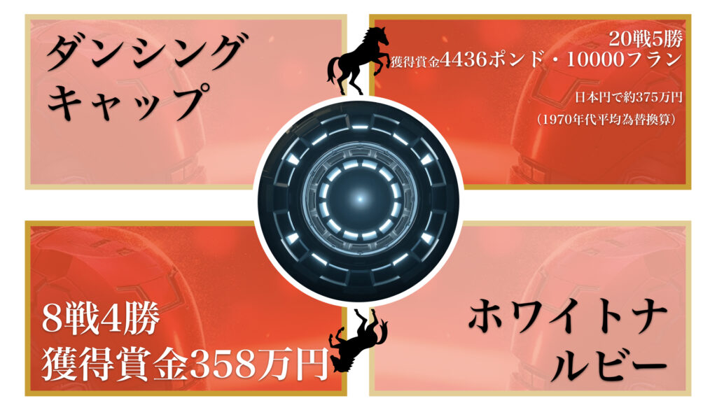 父はダンシングキャップ。🗽アメリカの伝説的名馬ネイティヴダンサーのラストクロップ(最後の産駒)。イギリスとフランスで現役時代を過ごし、積み上げた実績は計5勝。その中に際立った勝ち鞍はなく重賞制覇は果たせなかった。