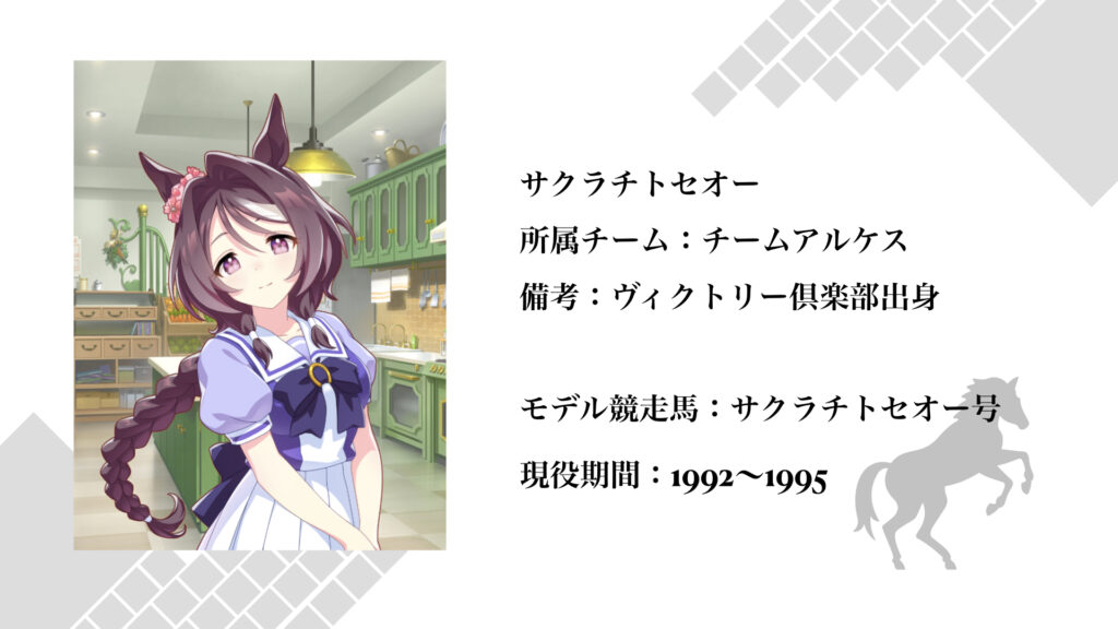 サクラチトセオーの基本情報は上記スライドの通り。所属チームはサクラローレルらと同じチームアルケス。サクラローレル・バクシンオー・チヨノオーらと同じヴィクトリー倶楽部の出身でもあります。