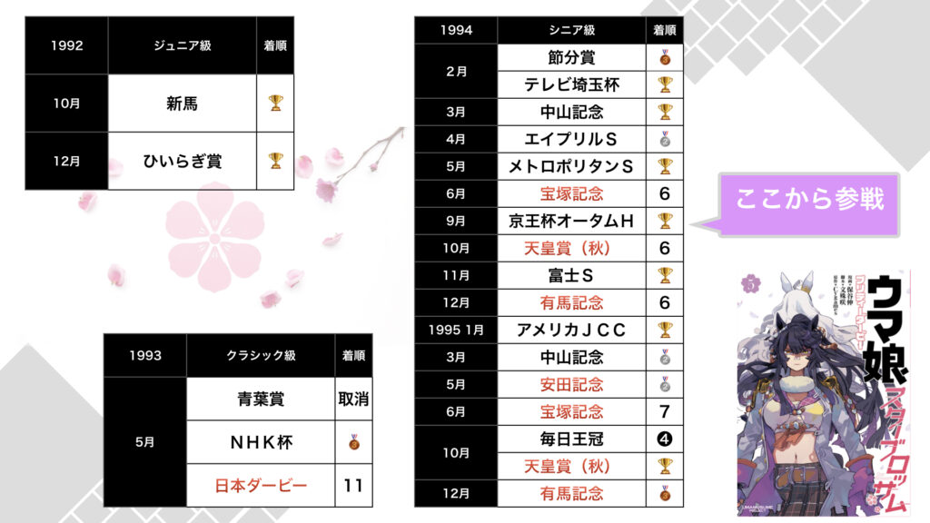モデルとなった競走馬の現役時期は1992~1995年。いわゆるクラシック1993世代。同期となるのはビワハヤヒデらBNWといった錚々たる面々。