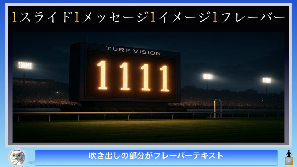 1枚のスライドに✉️メッセージ(=一番上の一行のみ)は一つ。メッセージを視覚化した🖼️イメージ画像を一つ。メッセージを細くする💬フレーバーテキストを最下段に一行。