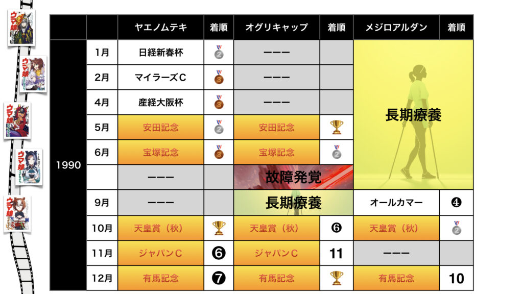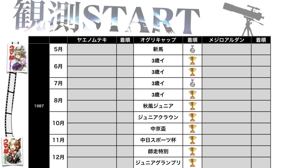 プレゼンの精度を向上するためにヤエノムテキ・オグリキャップ・メジロアルダン――3名の🏃♀️競争成績を一望できる表=戦績観測表も掲載しました。