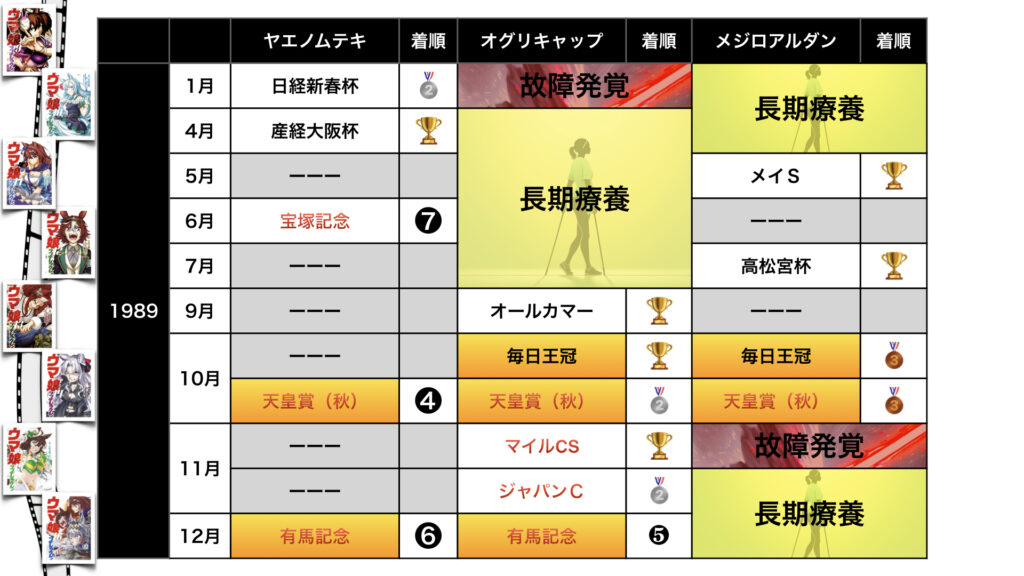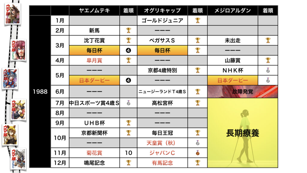 ヤエノムテキ・オグリキャップ・メジロアルダンのモデルとなった競走馬の戦績をご覧あれ。