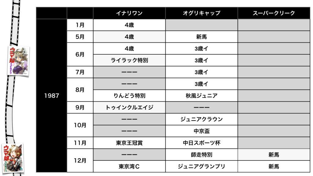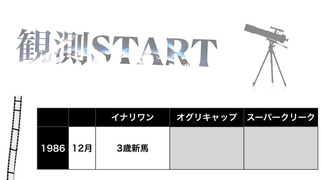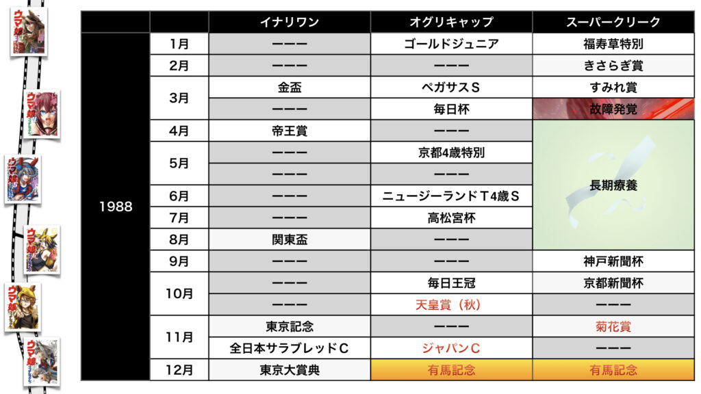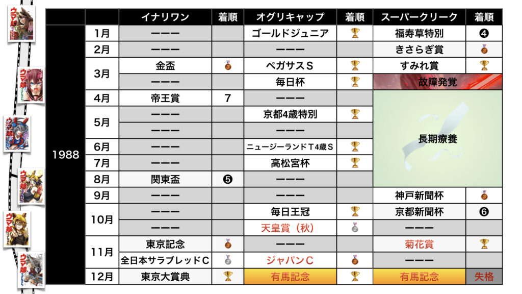 永世三強篇の始まりは白い稲妻篇の終盤と重複する。オグリキャップらがジャパンCと有マ記念に注力していた時期(史実における1988)にイナリワンが地方大井に在籍していた頃からが永世三強篇の幕開けだ。