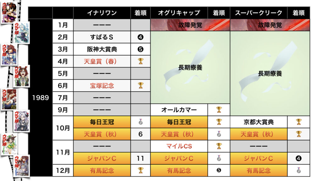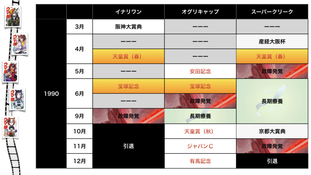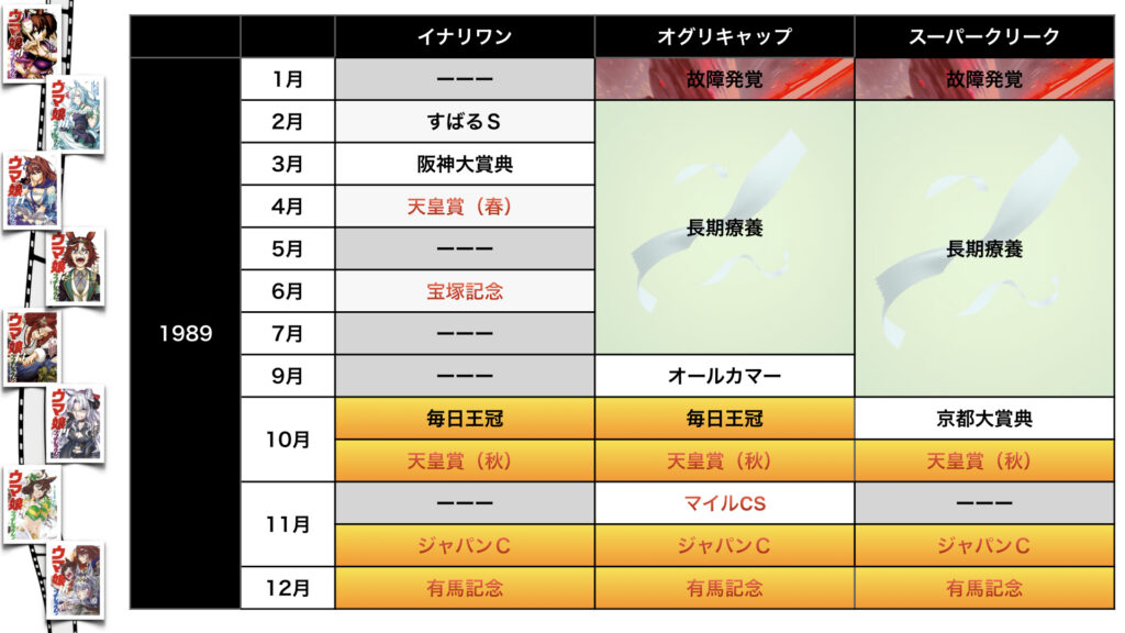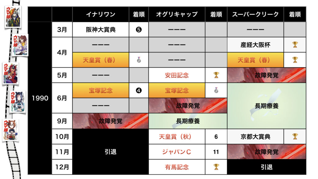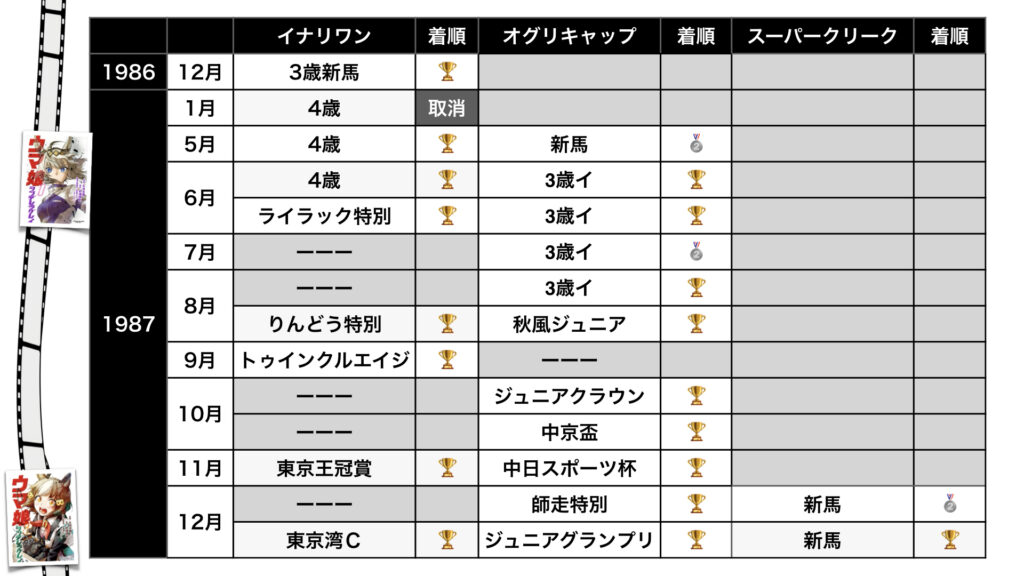 永世三強篇において彼女が走った最終レース3つはオグリキャップが白い稲妻篇で走った3つと全く同じであること。